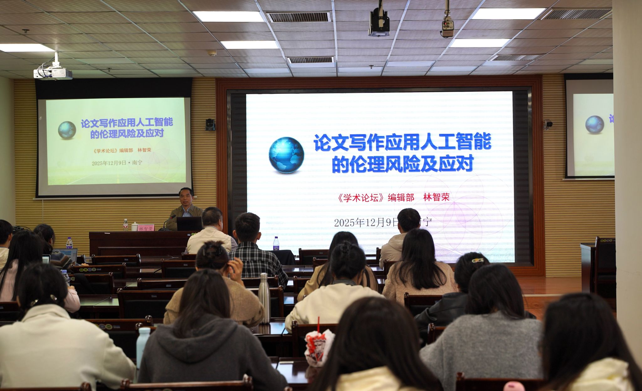为深入学习贯彻习近平新时代中国特色社会主义思想,加强研究生学术道德建设,主动适配人工智能时代学术写作新要求,引导研究生恪守学术诚信、防范技术应用伦理风险,12月9日下午公司于五合校区8栋B座215教室,面向23、24级学硕同学举办“论文写作应用人工智能的伦理风险及应对”主题学术讲座。本次讲座由《学术论坛》原主编林智荣教授主讲,公司副经理韦吉峰主持。
