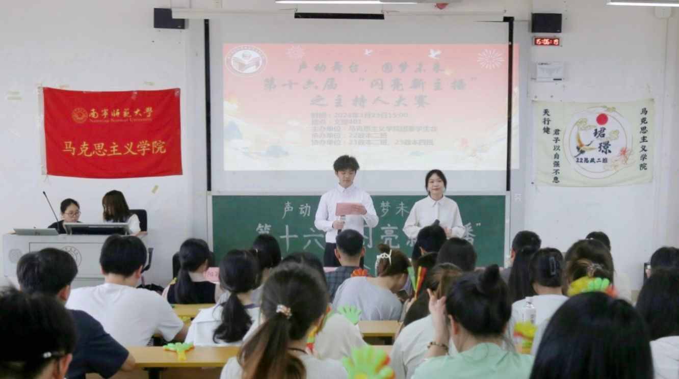 比赛伊始,艺术团成员带来开场节目《找自己》,紧接着白雪松老师作为评委代表发言,他指出,本次大赛的目的在于发掘既有深度理论积累又有实践能力的马院学子,为新时代文化传播注入新的活力,让马克思主义理论能得到进一步传播和普及。比赛过程中,参赛选手首先进行了两分钟的模拟主持,参赛选手们的选题紧跟实时新闻,表达清晰明了。随后,在配音环节中,选手们惟妙惟肖地演绎令人身临其境。在接下来的互动环节中,观众们踊跃参与,现场氛围高涨。在新闻评论的环节中,参赛选手们紧抓时政要点,侃侃而谈。比赛最后,第十五届闪亮新主播冠军韦宇晗、校广播站李青峰以及22政本2班班主任白雪松对选手进行了点评,他们肯定了选手们积极向上的精神风貌与临场发挥的能力,同时也指出了不足之处,有助于选手们提高自我,完善自我。