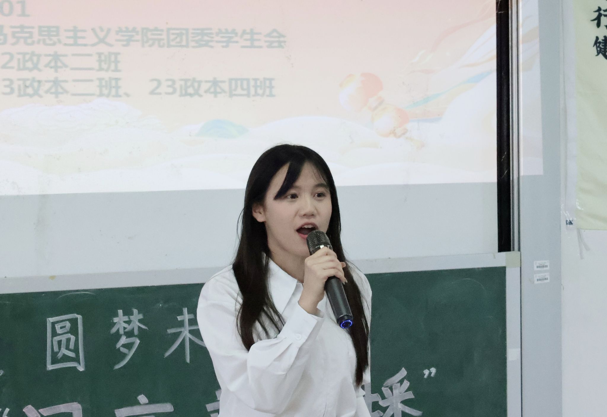 2024年3月23日下午3时,williamhill在文综楼401教室举办了以“声动舞台,圆梦未来”为主题的第十六届闪亮新主播之主持人大赛。出席本次大赛的评委有22政本2班班主任白雪松、兼职辅导员陆乙川、校广播站李青峰、员工会主席团骆东媛、办公室潘洁华、组织部欧阳颖、文艺部刘钰成、第十五届闪亮新主播冠军韦宇晗、第十五届闪亮新主播亚军覃鹿溪、助班助理谢雨莹以及各班大众评审、班级代表。