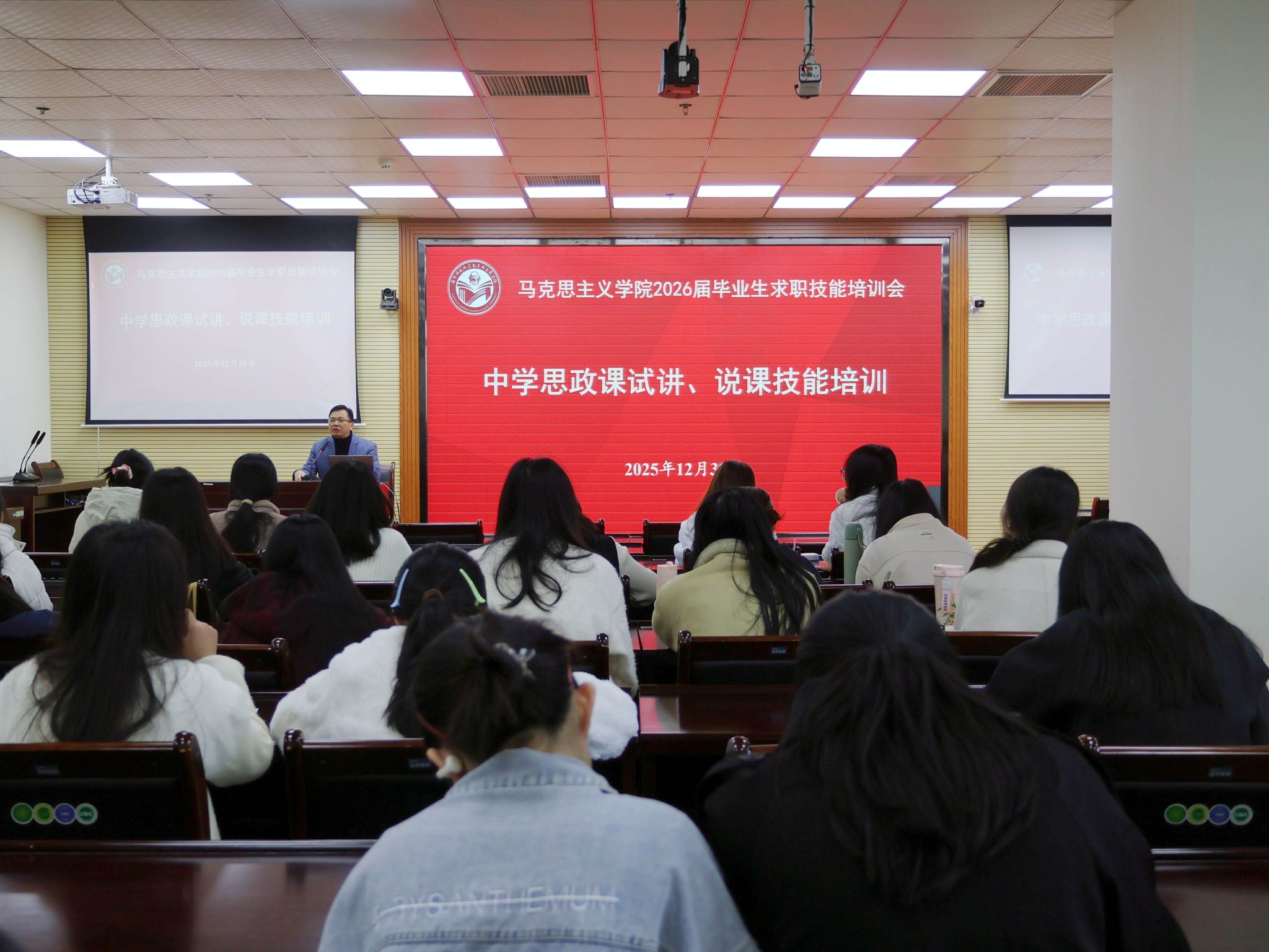 为提升2026届毕业生求职竞争力,帮助学子掌握中学思政课试讲、说课核心技能,公司于12月30日上午在五合校区8栋B座215学术报告厅举办了2026届毕业生求职技能培训会。公司党委副书记黄志海、辅导员王玉香及2026届毕业生参加本次活动。