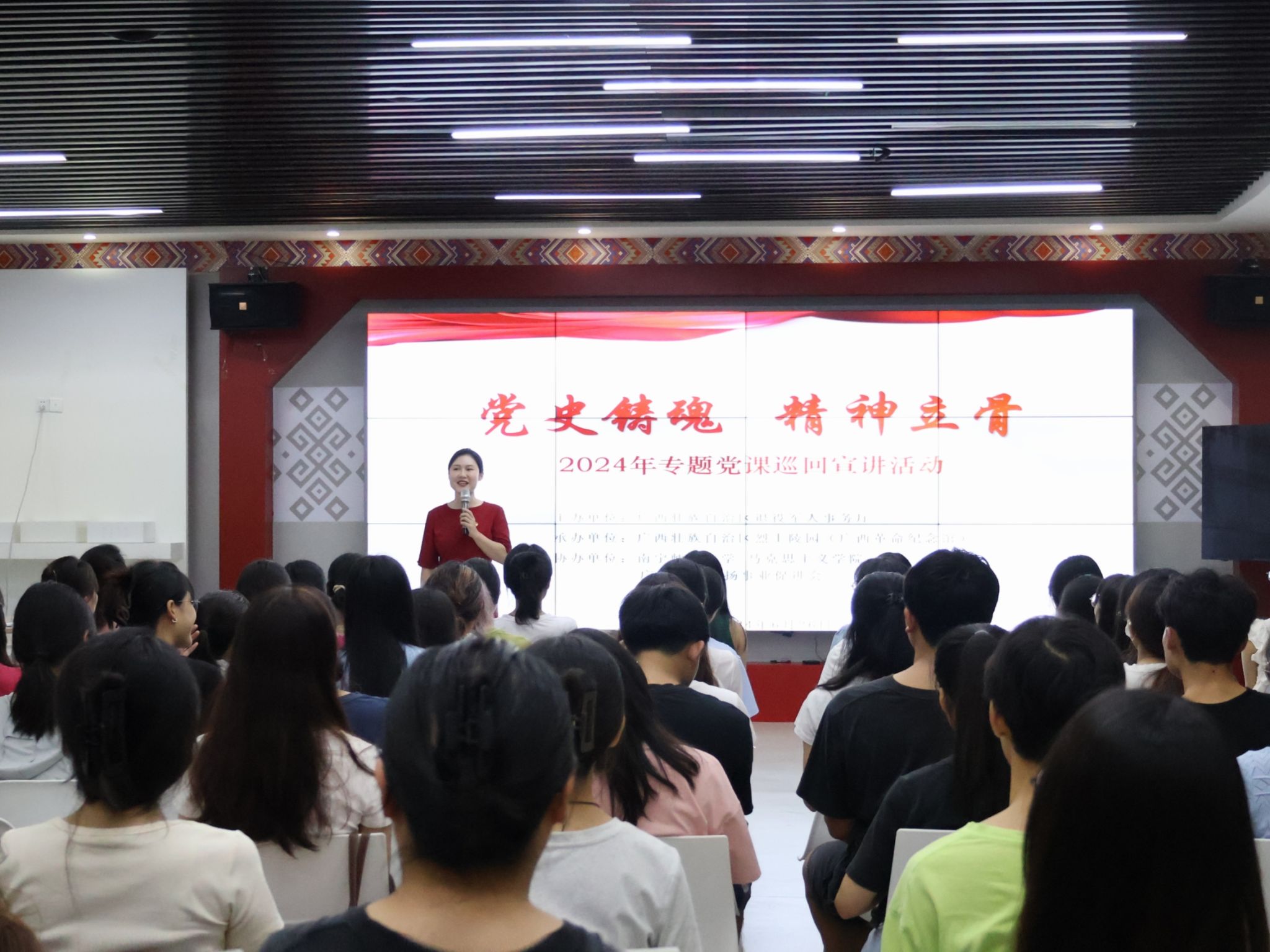 为贯彻落实党的二十大精神和习近平总书记关于烈士褒扬工作重要指示批示精神,充分发挥广西革命纪念馆爱国主义教育基地职能,推动新时代烈士褒扬工作创新发展,williamhill于2024年6月26日在8栋b座208报告厅开展了“党史铸魂,精神立骨”为主题的专题党课宣讲活动。本次课程的主题是“星火初照:中国共产党早期组织在广西的建立”,由韦江丽老师主讲。