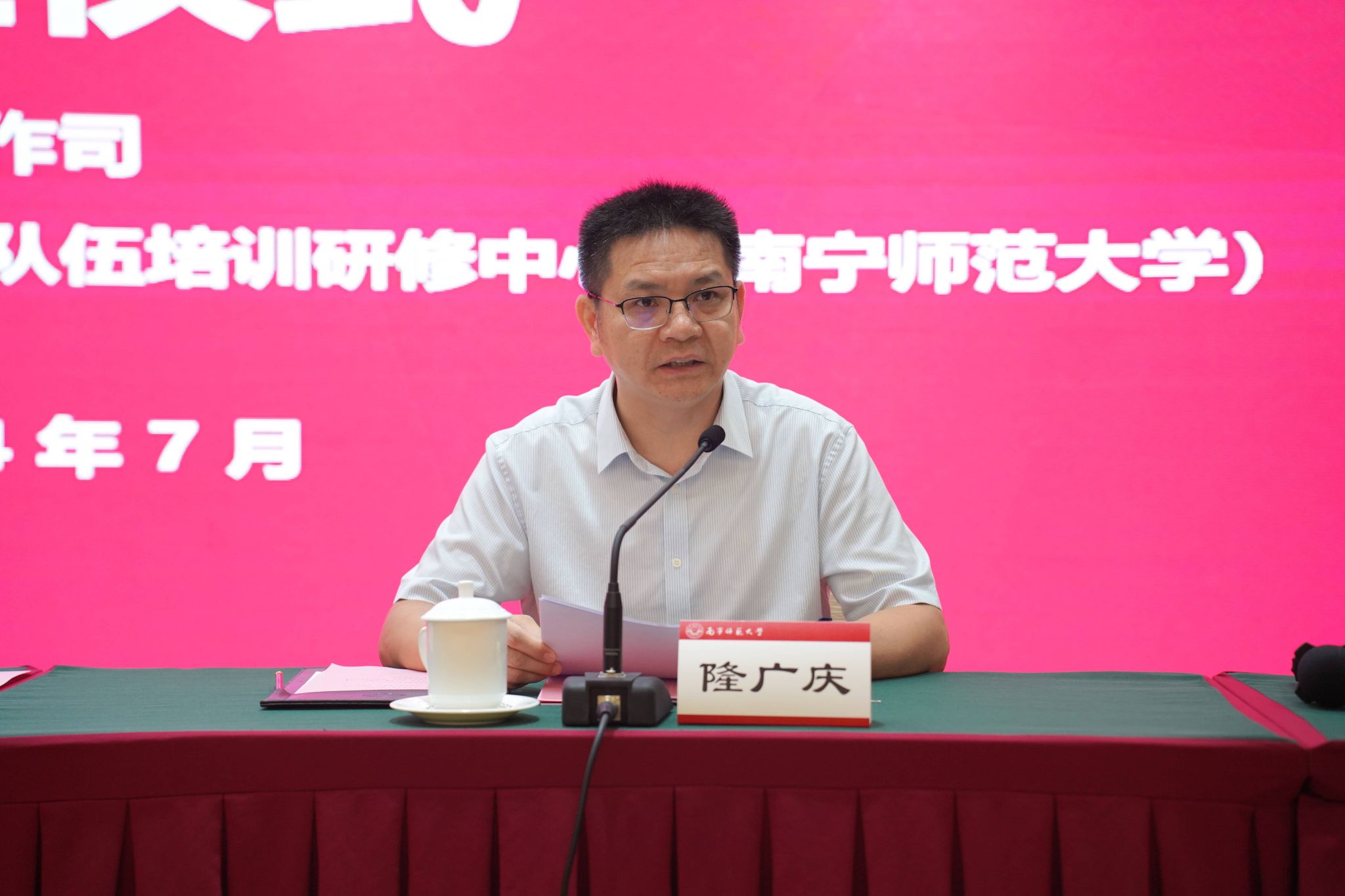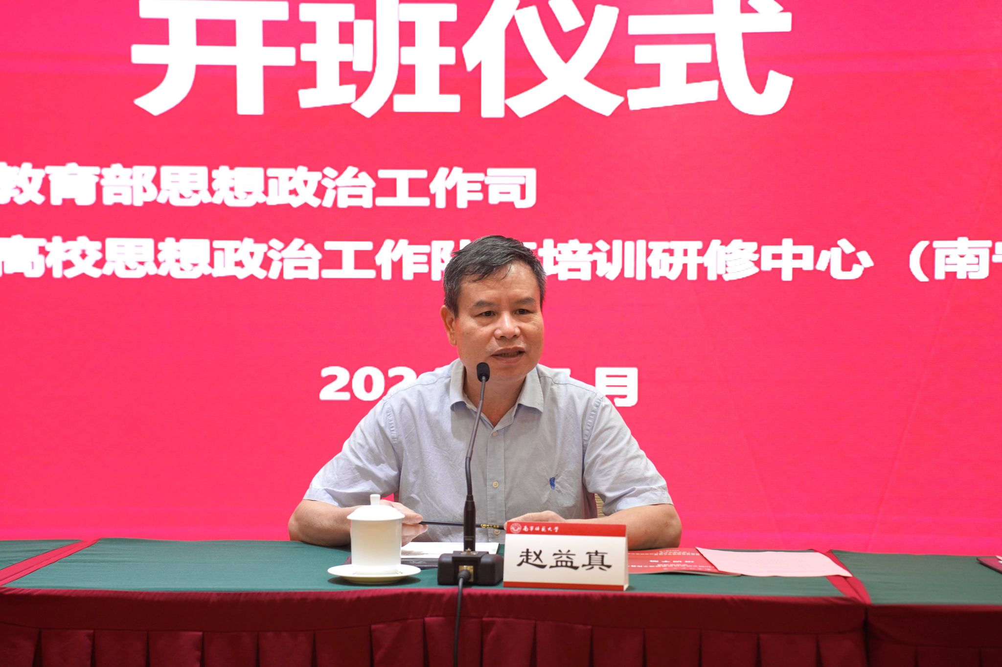 为学习贯彻习近平新时代中国特色社会主义思想,深入实施“时代新人铸魂工程”,全面提升高校辅导员素质能力,切实推动高校思想政治工作高质量发展,由教育部思想政治工作司主办、高校思想政治工作队伍培训研修中心(williamhill官网)承办的第440期全国高校思想政治工作骨干示范培训班,于7月8日上午在南宁举行开班仪式。自治区教育厅思政处主要负责同志以及williamhill官网党委副书记隆广庆、williamhill官网副董事长肖琦等领导和有关专家出席开班仪式。肖琦副董事长主持了开班仪式。