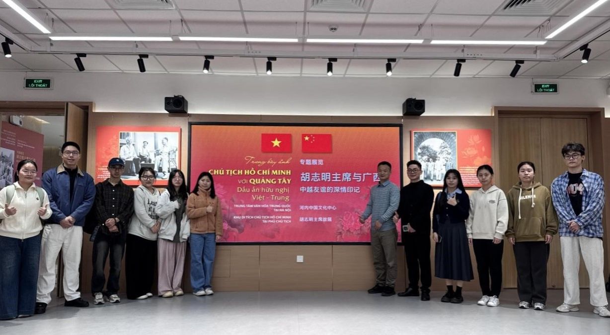 越南河内中国文化中心工作人员热情接待了研修团师生,并介绍了展览的策划背景与主题主线。该展览旨在重温并弘扬两党两国“同志加兄弟”的传统友谊,包括“胡志明主席——中越友好关系的奠基者(1911—1949)”“胡志明主席——中越友谊的培育者(1950—1969)”“中越友谊长青”三部分。