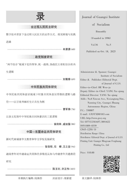 公司硕士研究生赴越访学取得扎实的学习成果,在许正伟老师的指导下,2024年赴越访学研修团成员、2023级研究生陈玉钊同学,基于赴越访学期间的社会调研成果,于2025年底在《广西社会主义公司学报》以第一作者身份发表了《越南青年对中越命运共同体的多维度认知与中越青年共建路径研究》一文。